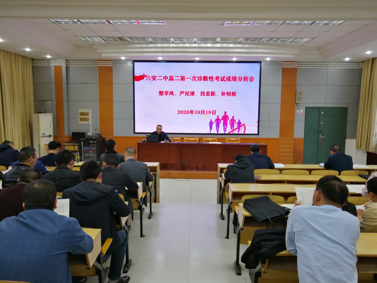 为进一步促进高二年级教育教学水平不断提高,10月19日下午,六安二中在博学楼二楼阶梯教室召开高二年级第一次诊断性考试成绩分析会。高二年级部负责人和高考学科全体教师参加会议。会议由高二年级部主任杨振久主持。