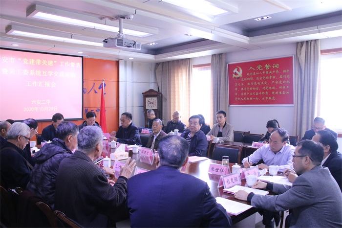 10月29日下午,市关工委常务副主任薛建宏带领市关工委及市委组织部、金寨县关工委、裕安区关工委、市直关工委等单位有关负责同志,来六安二中开展全市“党建带关建”督查暨关工委系统互学交流活动。党委书记、校长关世宏,党委委员、副校长李守宏, 校关工委主任魏先根及相关处室负责人陪同督查。