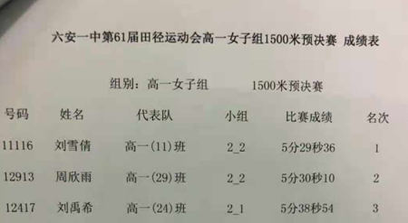 11月4日,六安一中第61届田径运动会激战正酣,赛场上传来令人振奋的消息:高一年级三位同学在女子1500米比赛中,一举打破学校尘封了43年之久的记录。