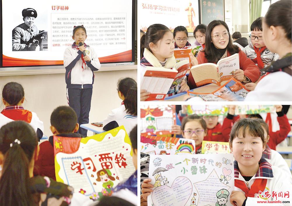 3月3日,在六安市解放路第一小学五年级(三)班的主题班会上,雷思语同学结合自己学习的雷锋故事,向同学们讲述她心目中的雷锋形象(左图)。同学们在老师的带领下一起阅读雷锋故事(右上图);五(3)班的章钰淼同学展示自己制作的“学习雷锋”主题手抄报。