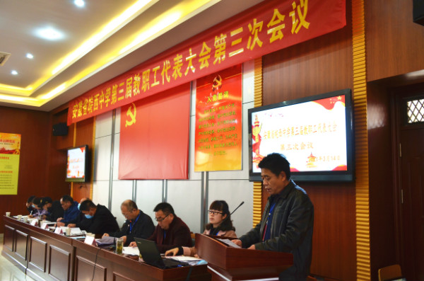 下午3时20分,全体代表听取了方春艳同志关于上届提案的答复和本届提案征集的情况汇报,听取了杨曼同志关于本次议案的修改说明。全体代表对两份报告和一项议案进行表决,会议一致通过了《学校工作报告》、《工会工作报告》和《皖西中学教职工一次性效能奖考核方案》。