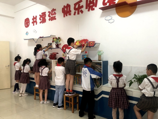 图书整理。在图书漂流角,在班级图书柜,图书整理小能手们正小心翼翼地擦拭、归类、摆放。望着一本本书齐齐整整地待在了属于自己的格子里,同学们露出了会心的微笑。