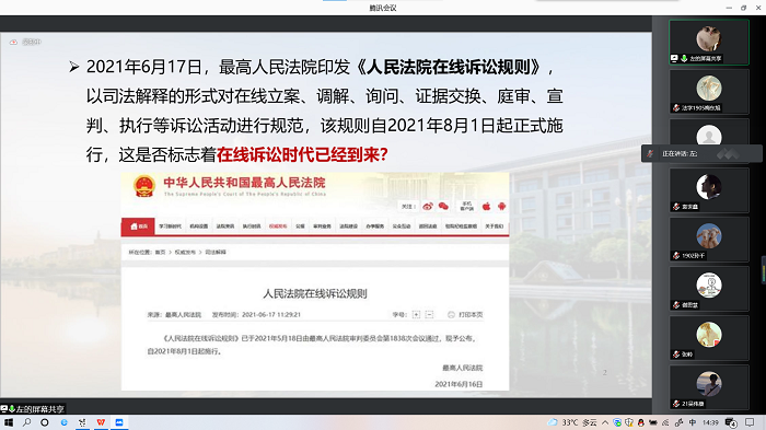 在8月7日第149期“在线诉讼时代到来了吗”主题报告中,左卫民教授首先系统的介绍了信息时代与在线诉讼的兴起。他通过数据分析与总结比较,阐述了在线诉讼兴起的时代背景:一是互联网技术迅猛发展,中国社会正在进入在线时代,而在线时代催生在线诉讼的兴起;二是司法信息化建设推动在线诉讼的探索;三是新冠肺炎疫情大大加速在线诉讼的发展。左卫民梳理了在线诉讼的法律依据:2018年9月,《最高人民法院关于互联网法院审理案件若干问题的规定》中,规定和明确了互联网法院的权限与在线诉讼规则;2020年1月15日,最高人民法院印发《民事诉讼程序繁简分流改革试点方案》,进一步明确了相关电子诉讼规则,包括,明确电子化材料提交效力、确立完善在线庭审规则、完善电子送达机制等等;疫情期间及后疫情时代,2020年2月《最高人民法院关于新冠肺炎疫情防控期间加强和规范在线诉讼工作的通知》扩大了在线庭审的适用范围,民商事、行政案件一般均可以采取在线方式开庭;对适用简易程序、速裁程序的简单刑事案件、认罪认罚从宽案件,以及妨害疫情防控的刑事案件,可以探索采取远程视频方式开庭等等。2021年6月17日,最高人民法院印发《人民法院在线诉讼规则》,以司法解释的形式进一步规范在线诉讼活动。左卫民还通过对比国内外对在线诉讼相关研究总结了在线诉讼的优劣势,他指出,国内外学者都充分认识到在线诉讼这一新型诉讼方式的兴起,并围绕与之相关的在线法院、在线庭审等问题进行了研究,积累了一定的研究成果,但是有关在线诉讼的整体研究水平滞后于实践的快速发展。