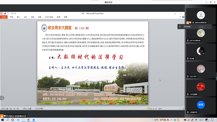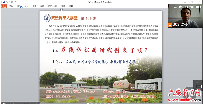 人类社会正在步入在线时代,在线诉讼由此而开始成为司法的一种新方式。2021年6月17日,最高人民法院印发《人民法院在线诉讼规则》,以司法解释的形式对在线立案、调解、询问、证据交换、庭审、宣判、执行等诉讼活动进行规范,该规则自2021年8月1日起正式实施,这是否标志着在线诉讼时代已经到来?随着大数据、人工智能的迅猛发展,大数据时代法科生如何才能更好的适应法律学习?2021年8月7日下午、8月8日下午,应皖西学院法学院邀请,第四届全国十大杰出青年法学家、中国法学会理事、中国刑事诉讼法学研究会副会长、国家高层次人才特殊支持计划领军人才,四川大学法学院院长、博士生导师 左卫民教授做客皖西学院“政法周末大讲堂”第149期、第150期,通过腾讯会议在线上分别以“在线诉讼的时代到来了吗”“大数据时代的法律学习”为主题作报告。两场报告吸引了我校法学院师生(包括2021级刚录取的法学专业新生)、法律实务工作者近600人在线聆听了报告。皖西学院法学院院长刘鑫教授主持报告并做总结。