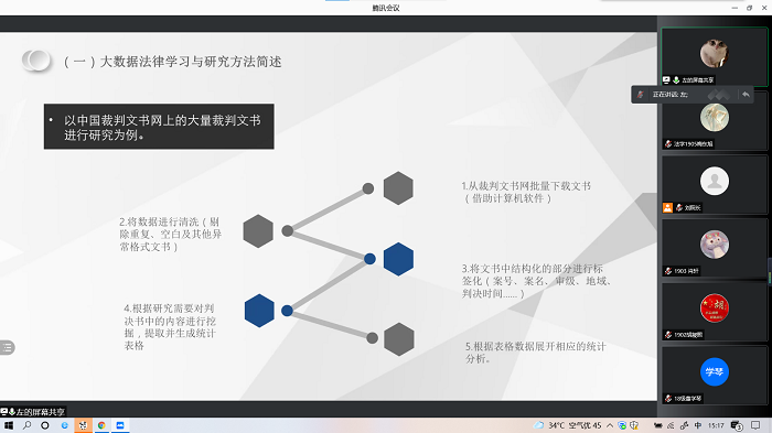 围绕大数据法律学习的基本问题,左卫民教授从立法与实践的差异、既有范式存在的认知缺陷、传统法学研究方法无法满足信息时代的根本特征与必然要求三个方面详细分析了“为什么要进行基于数据的法律学习与研究”。左卫民指出,针对大数据法律学习与研究要从基于数据迈向基于大数据,他以中国裁判文书网数据为例,分析了大数据的特点,即数据的海量性、数据内容的丰富细致、数据的客观性和不反应性、数据相应的可生成性、数据搜集分析的个性化。基于上述特点,如何进行大数据法律学习,左卫民教授以中国裁判文书网上的大量裁判文书进行研究为例说明大数据法律学习与研究方法。左卫民教授还以四川省刑事辩护率的大数据研究为例,详细分析了目前我国的刑事辩护率现状,提出应当重拾以被告人经济困难程度为标准来配置刑事辩护资源的思路,并由此构建相应的制度。他以“基于某区法院近三十年审判实践的实证分析”进一步分析了“诉讼爆炸”的中国应对,左卫民教授详细地阐述了出现“诉讼爆炸”现象的成因,人口增长使更多纠纷出现;经济的快速发展不仅推动了契约的发展,也使得更多资源投入到诉讼当中;律师参与度的增长也是不可或缺的因素之一;诉讼费用的降低以及诉前调解机制的式微和公众诉讼权利意识的增强也导致人们更倾向于通过诉讼方式解决争端。当前我国对于诉讼爆炸的应对措施,左教授介绍了常规方法、最新举措和在线诉讼三种中国式的经验。常规方式包括最直接有效的“加人”即增加法院工作人员尤其是法官的数量、加班以缓解“人案矛盾”、通过简易程序和速裁程序提高诉讼效率、推动法院管理层领导办案和提高法官职业素质五个措施。在最新举措中,左教授简单介绍了C省W区采取的审前调解机制,同时将W区采取该措施前后的案件数量对比以及和基本情况相同的市区作对比,基于统计学的分析最终得出该举措确实发挥作用。在线诉讼更多地是为了适应新冠疫情爆发而采取的措施,在疫情防控常态化的背景下也起到了提高诉讼效率、缓解诉讼压力的作用。就中国的诉讼爆炸是否还会持续这一问题,左卫民教授认为短期内增长的趋势会有所放缓,不同区域存在不同情况,但整体上这一现象还会持续,而是否会一直持续还是取决于诉讼外的纠纷调解机制起不起作用。未来可以通过建设多元化纠纷解决机制、总结新时代“枫桥经验”、调整法院内部组织机构、适当增加诉讼爆炸区的法官数量等司法资源等措施来更好地应对诉讼爆炸。左卫民教授以“基于员额法官遴选的实证考察”为例,分析了法官是怎样炼成的。他将自己的研究成果和毫不吝啬的传授给师生。