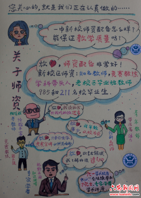 这份原创手绘地图的创作者是六安一中美术教师陈仁义。他告诉记者,新学期六安一中新校区即将投入使用,自新校区开建以来,受到学生家长和社会各界的关注,学校想在开学前以一种既能一目了然又贴近学生的方式,解答并回应学生和家长最关注的问题,同时也想宣传展示一中新校区形象和态度。