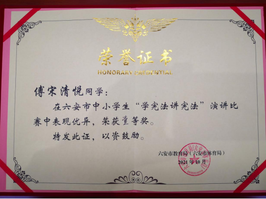 喜报——六安二中学生荣获市中小学“学宪法讲宪法”演讲比赛和知识竞赛一等奖