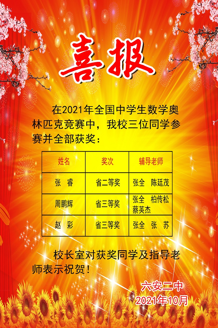 喜报——六安二中学生在2021年全国中学生数学奥林匹克竞赛中荣获佳绩 编辑:汤晓雪 来源:六安二中 浏览次数: 次 发布时间:2021-10-28 10:52:48 【字体:小 大】 扫一扫在手机打开当前页 【打印正文】 上一篇:喜报——六安二中学生在2021年全国中学生物理奥林匹克竞赛中荣获佳绩 [ 2021-10-28 ] 下一篇:桂香飘满校园,好书伴我成长 [ 2021-10-28 ]