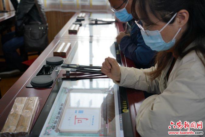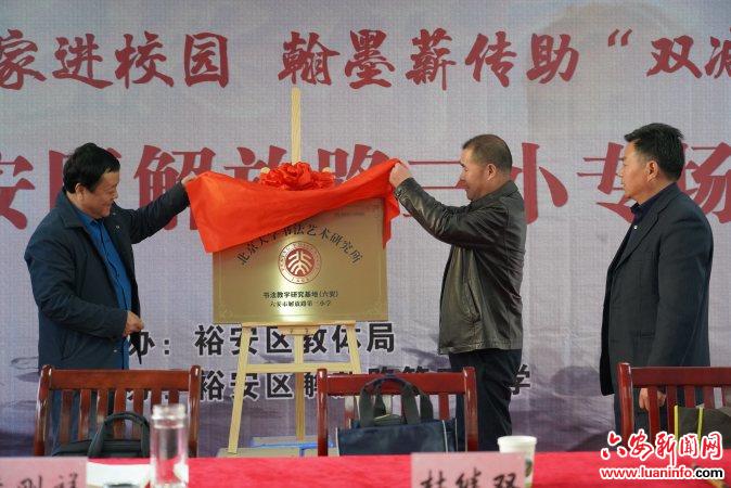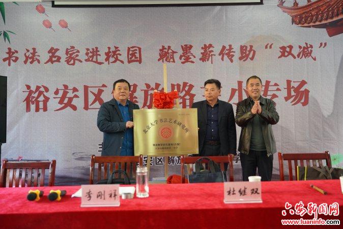 活动伊始,六安市解放路第三小学校长陈德山致词,回顾了学校6年来在写好字方面的目标定位和取得的效果,希望学校师生用涓涓笔锋,书写自己艺术的梦想。裕安区教体局副局长李刚祥对于六安市解放路第三小学在全市率先开设“互联网+”智慧书法教室,采取“线上+线下”书法同步教学模式给与充分肯定。他强调,汉字是中华文化之根,中华民族之魂,要端端正正写方块字,堂堂正正做中国人,勉励学生要从小养成良好的写字习惯。随后,李刚祥与北京大学书法艺术研究所副研究员,中国教育学会书法教育专业委员会理事,中国书法家协会会员武韶海教授共同为六安市解放路第三小学授予全市首个“北京大学书法艺术研究所——书法教学研究基地(六安)”奖牌,表彰三小在培养小学生书法兴趣、推进“双减”政策中做出的贡献。
