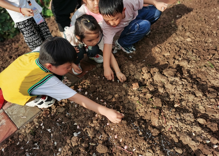 一畦畦新翻耕的田园里,嫩绿的菜苗被孩子们小心地放进泥坑中,埋土,浇水……这是六安市城北第二小学“耕读农场”秋季开种仪式上的场景。“双减”政策出台后,教育回归初心,教育的终极目标更加突出——立德树人、实践育人。因此,坚持将教育与生产劳动相结合是学校的探索目标。在“双减”政策的背景下,学校在校园一角开辟的‘耕读农场’应运而生, 更好地为劳动教育的实施保驾护航。