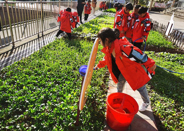 九月初,班主任和指导员一起确定适合当季种植的植物品种,并提前准备菜地、劳动器具。在农耕园里,指导员组织学生们兴致勃勃地开展松土、播种、浇水、除草活动。在同学们的悉心照料下,农耕园的植物长势喜人。12月1日,农耕园举行采摘活动,同学们看到自己的付出有了回报,格外开心。