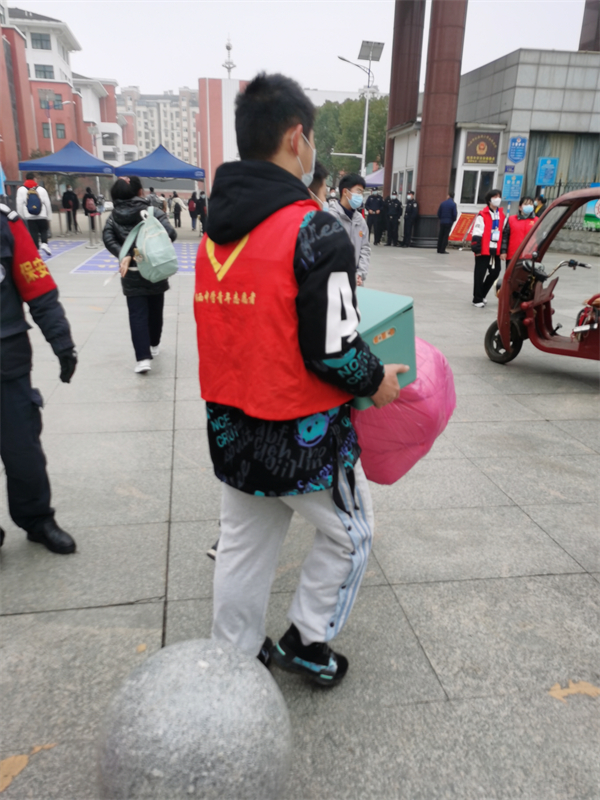 早上7点钟,一张张洋溢着笑容脸庞的学生会成员就等在校门口欢迎同学们的归来。志愿者们告知返校同学的进校流程,协助保卫科维持大门口秩序,回答来自家长的问题,面对行李较多的同学,他们还帮助搬运。同样是十几岁的他们,接过一个又一个沉重的包裹,把它们送到宿舍中,用自己的一份力量帮助返校的同学减轻负担。