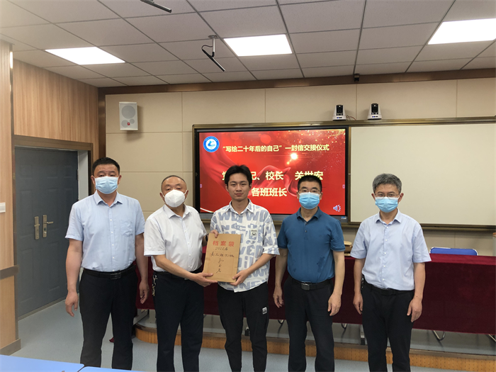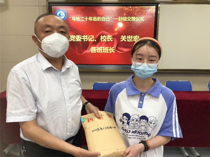 随后,在欢快的乐曲声中各班班长依次将同学们的《致二十年后自己的一封信》交给关校长,关校长微笑着一一收下,并同班长们逐个合影留念。