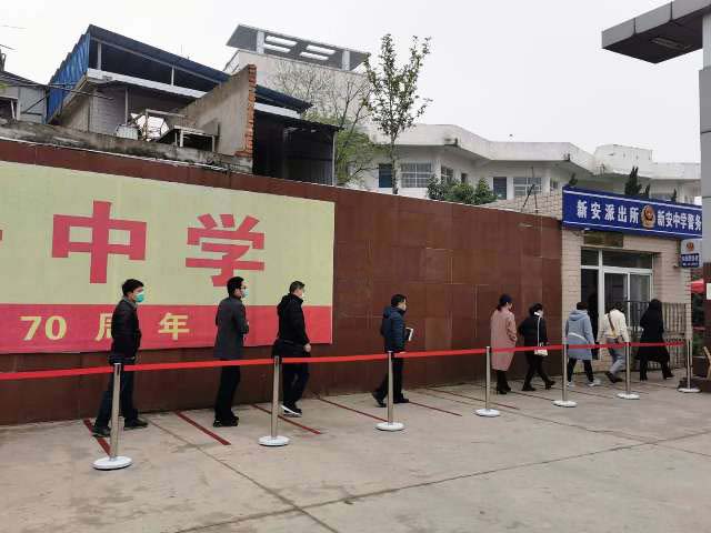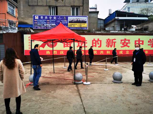 为了做好高三返校复课后的疫情防控工作,新安中学在校大门口进行了疫情防控教职员工进入校园红外测温演练。