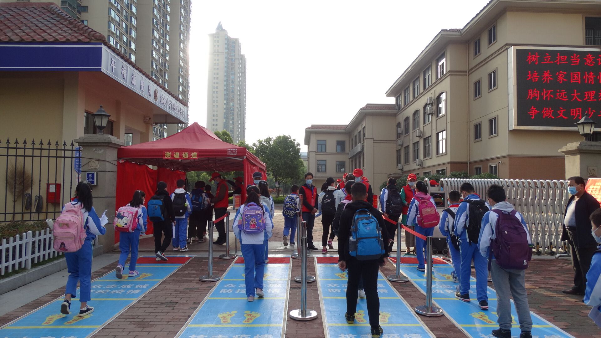 学校按照上级部门要求,在校领导的积极谋划,精心布局下,在学生返校前,对校园进行了全面的清扫消毒、设置门前通道等一系列准备工作,并采取错峰入校离校,错时上学放学,真实有效量体温等一系列硬核措施,保障了学生有条不紊、安全有序的入校。