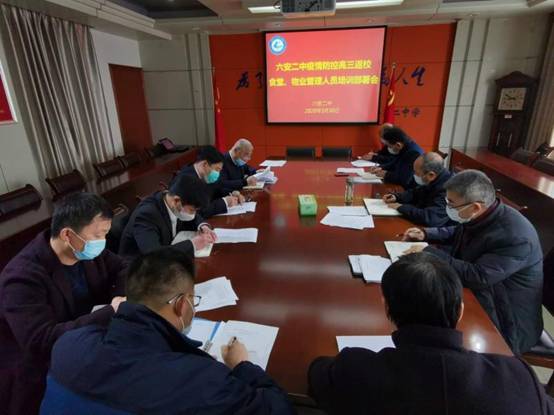 为进一步加强学校新冠肺炎疫情防控工作,确保全校师生员工的身体健康和生命安全,日前,六安二中在综合楼九楼第一会议室召开了疫情防控学生返校食堂、物业管理人员培训布署会。校长关世宏,副校长罗会武,食堂、物业负责人及总务处相关人员参加了会议,会议由总务处主任詹明忠主持。