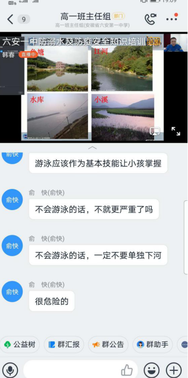 随着气温逐渐升高,我市已进入溺水事故的多发期;同时随着学生陆续返校,该校的防疫工作也面临挑战。为普及防溺水和防疫安全知识,增强学生自我防护能力,4月18日六安一中邀请了六安市蓝天救援队龚老师通过钉钉直播平台为全校学生做了一场安全知识讲座。