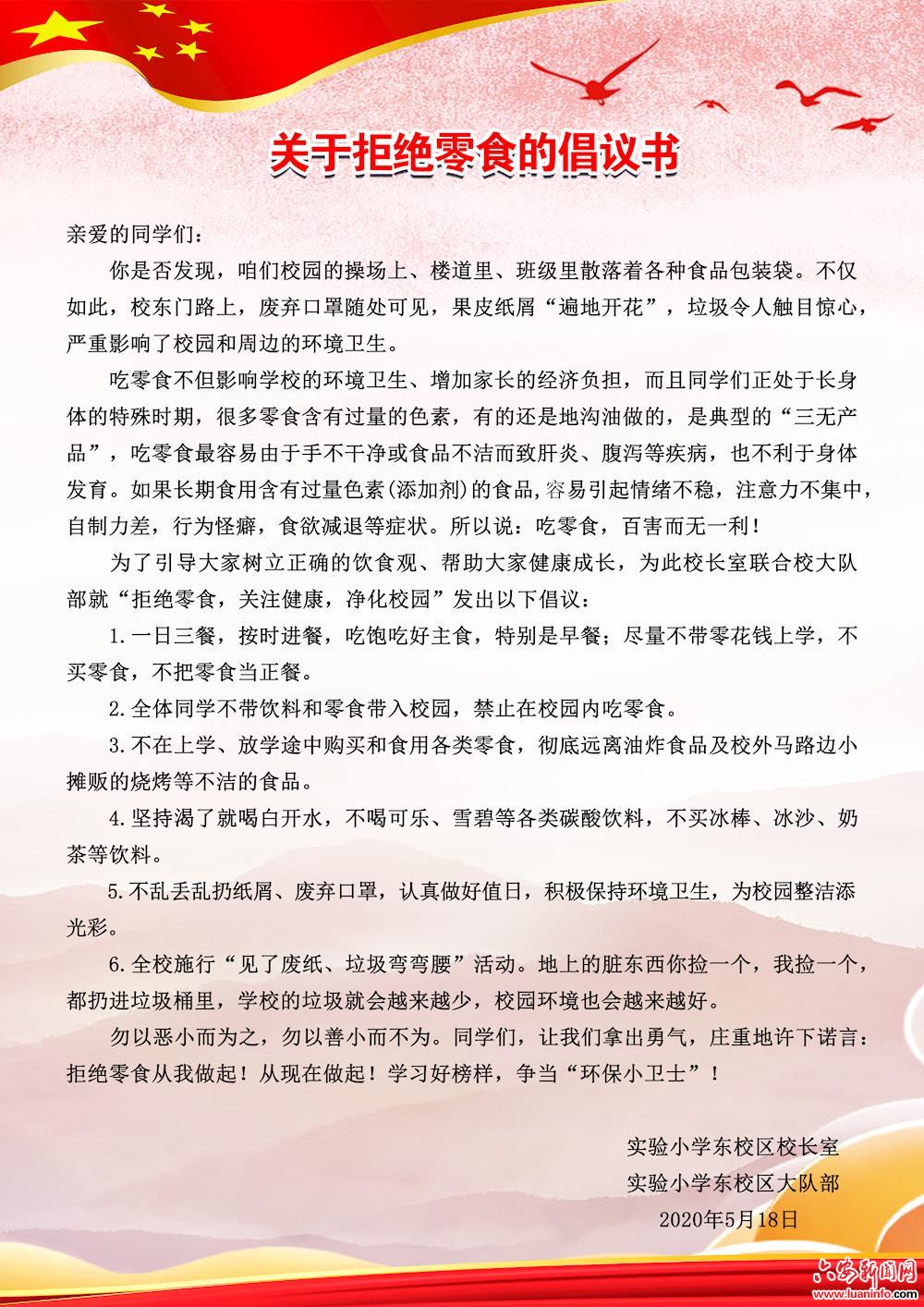 为了孩子们的健康成长和养成良好的饮食卫生习惯,让同学们拥有一个干净、整洁的校园环境,促进校园的和谐文明发展,实验小学东校区校长室联合校大队部开展了“拒绝零食 关注健康 净化校园”的倡议活动。