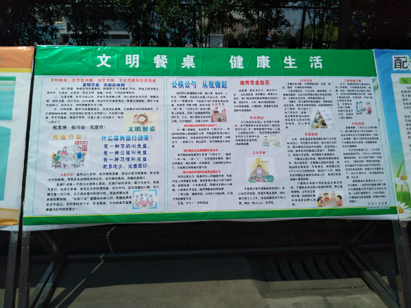 校团委制作了《文明餐桌倡议书》和“文明餐桌、健康生活”宣传展板,在食堂桌上张贴“文明餐桌”宣传标语,向同学们普及文明就餐常识,并号召大家向身边的人宣传文明常识。活动中,志 愿者们认真维持餐厅就餐秩序,积极组织大家礼貌排队就餐,提醒同学们用餐后自觉将餐具送回收残处,倡导光盘行动,节省了食堂工作人员的时间,创造了一个良好的就餐环境。志愿者们的表现得到了全校师生的一致好评。