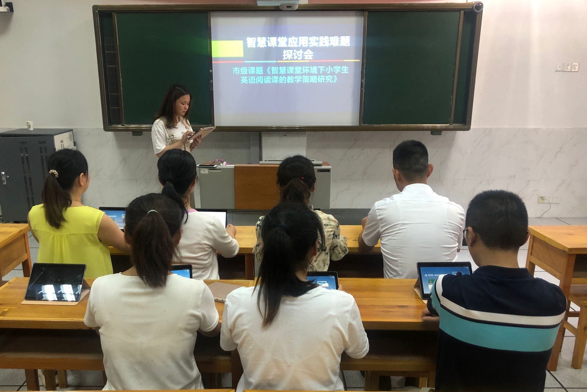 接下来,由科大讯飞的高老师为我们解惑答疑,大家纷纷提出返校以来智慧课堂教学实践中出现的难题,高老师耐心讲解,课题组成员认真学习操作。实验班教师互相探讨,分享经验。