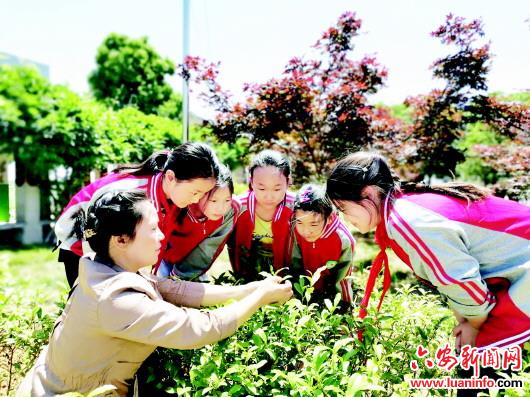 5月12日,裕安区狮子岗乡杨店小学部分学生在老师的带领下走进该校的“茶香小院”种植园观察茶叶长势,除草,体验劳动乐趣。
