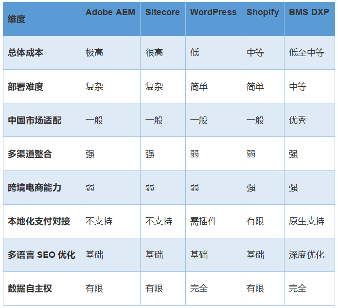 在全球数字体验平台市场中,已有多款成熟的国际产品,如Adobe Experience Manager(AEM)、Sitecore、WordPress、Shopify等。这些平台各具特色,但在服务中国出海企业时,都存在不同程度的"水土不服"。