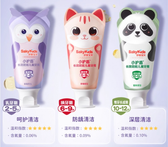 深耕儿童口腔护理领域多年,舒客宝贝创新性提出“儿童分龄护齿”理念,精准匹配0-12岁不同成长阶段儿童的口腔发育特点,打造出科学适配的专业防蛀产品矩阵。针对2-5岁乳牙期、6-9岁换牙期、10-12岁恒牙长成期三大关键阶段,品牌推出小护盾防蛀儿童牙膏,通过科学调控氟化钠含量(2-5岁0.06%、6-9岁0.09%、10-12岁0.10%)实现12小时长效防蛀,搭配草莓、蜜桃等童趣香型提升孩子使用接受度。同时,配套推出密柔护齿儿童牙刷、K2电动牙刷等产品,从清洁工具到护理配方形成全场景防蛀解决方案,让科学护牙更具针对性与趣味性。