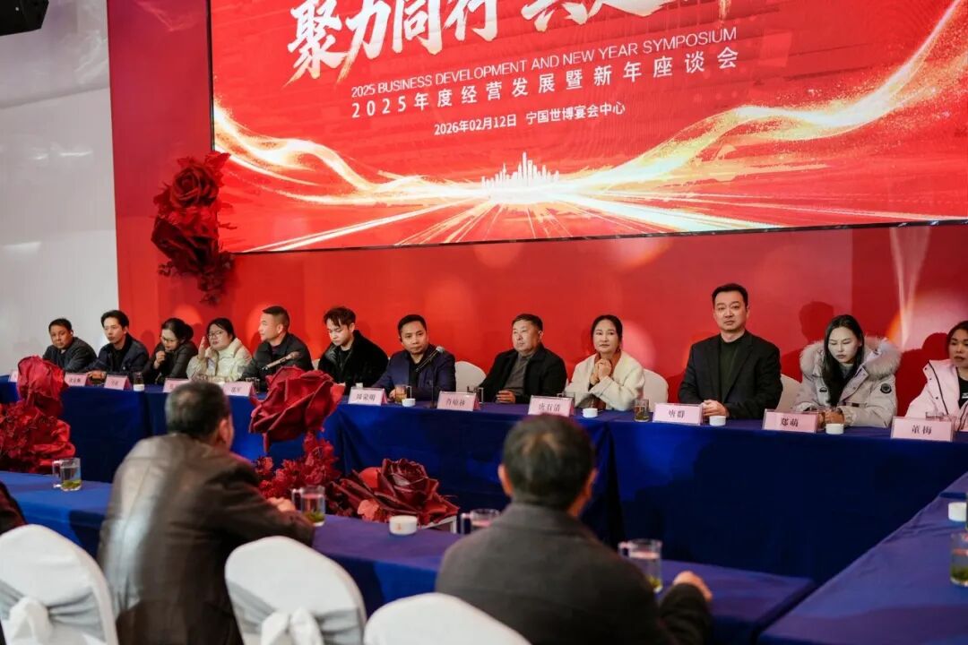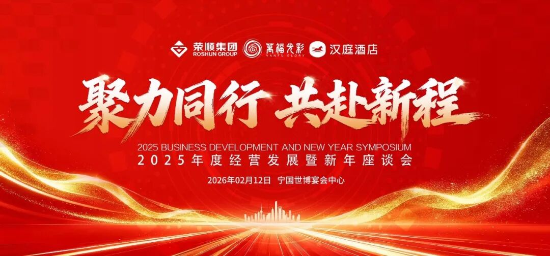 金马贺岁,策马迎新。2026年2月12日,荣顺集团、万福光彩大市场、汉庭酒店2025年度经营发展暨新年度座谈会在宁国召开。全体在职员工,部门经理和集团管理层应邀出席大会,共举庆贺之杯,同享欢聚时光。荣顺集团创始人、董事长周荣明,集团执行董事、雄伟商贸董事长肖培林,集团总裁唐有清,集团副总裁周正汉,办公室主任焦玉霞,市场运营部总经理郎军,商务拓展部总经理唐群。大会由宁国汉庭酒店店长余福全主持。