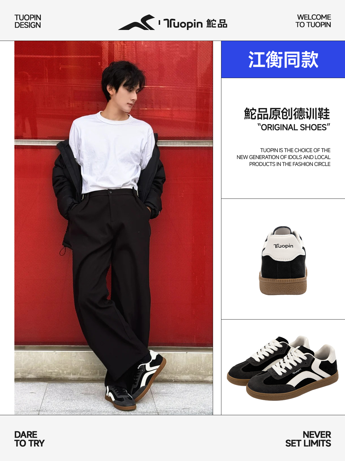 鮀品品牌成立于2010年,多年来深耕休闲鞋领域,于近年推出多款风格不同的原创设计德训鞋,凭借其舒适的穿着感受与休闲百搭的风格深受广大用户喜爱与信任,也深受内娱多位流量艺人的青睐。