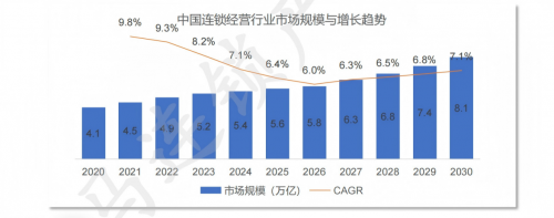 中国连锁产业正站在一个微妙的历史关口。数据不会说谎。2020年至2025年,连锁行业整体市场规模增速从9.8%逐年下滑至6.4%。规模红利正在消退,取而代之的是一个更冷酷的词汇:效率红利。