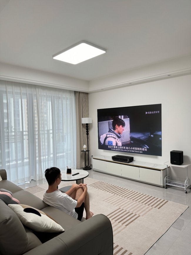 此外,它的安装便捷性也值得称道。120寸屏幕重量仅21kg,主机重量11.3kg,不到同尺寸液晶电视重量的30%。配合0.25的投射比,离墙35cm即可投出120吋巨幕,让超大尺寸真正走进了普通家庭。