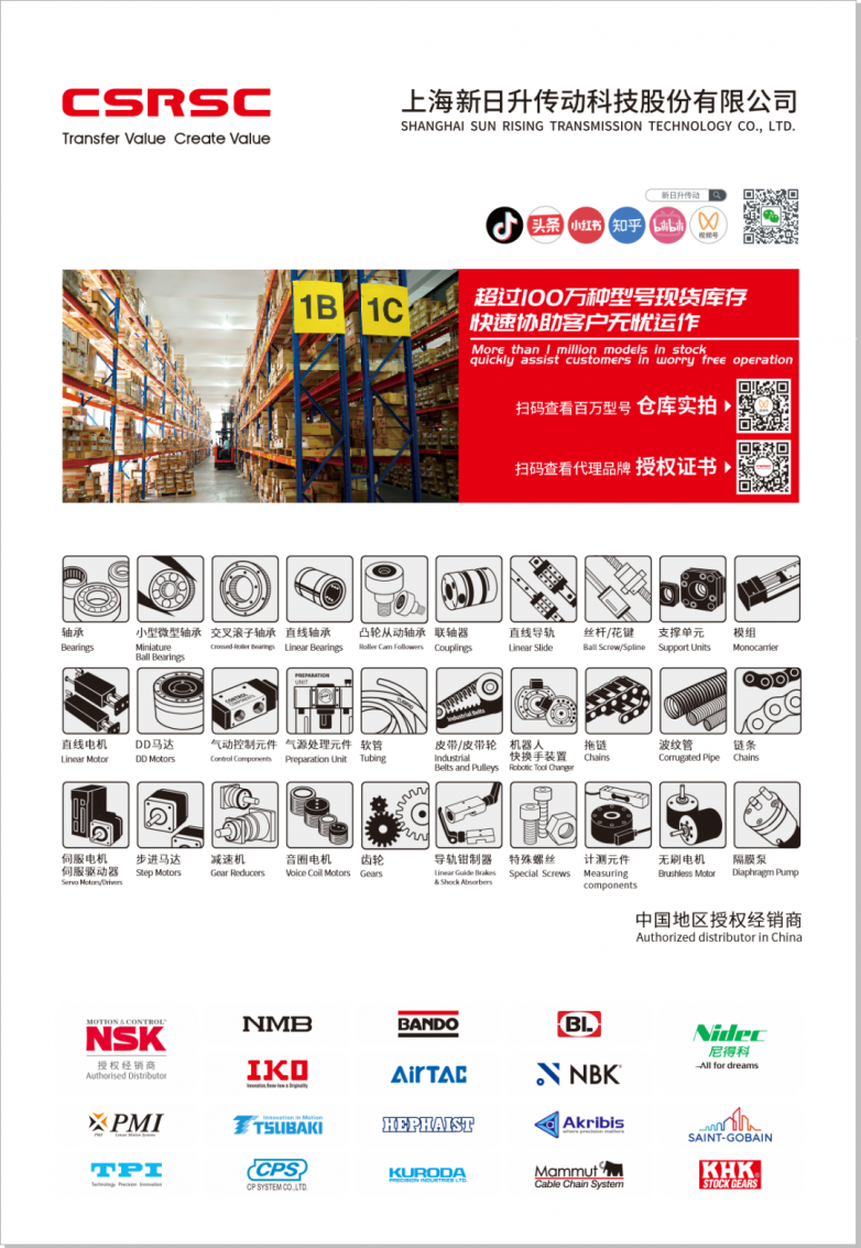 新日升聚焦传动产品的集成供应与服务,始终专注于进口轴承及传动产品的销售与服务,与NSK、NMB、IKO、BANDO、BL、PMI、黑田、TPI 、赫菲、NBK、CPS、椿本、Nidec、AirTAC、AKRIBIS、犸慕、圣戈班、KHK等多个国际知名品牌建立长期授权合作关系,拥有超过100万种型号的现货库存,可快速响应客户需求,助力用户无忧运作;同时提供智能化传动系统解决方案,助力客户实现降本增效,提升设备管理水平,并分享多领域成功应用案例,为客户提供有价值的参考,覆盖从核心零部件到整机集成的全场景传动需求。