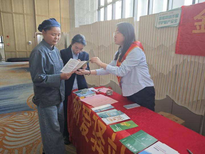 活动现场,支行精心部署、多维发力,通过“定点宣传+主题宣讲”双模式,确保宣传入脑入心、取得实效。在酒店会议室门口,宣传服务点整齐有序摆放,小分队成员化身“金融宣传员”,主动向前来参会及过往的酒店工作人员发放金融知识折页,以通俗易懂的语言、真实典型的案例,面对面、一对一开展宣讲,重点普及防范电信网络诈骗、反洗钱等核心知识,细致拆解“刷单诈骗”“冒充公检法诈骗”“虚假网络贷款”等高频骗局的作案手法和识别技巧,反复叮嘱大家守住“钱袋子”,切实筑牢金融安全思想防线。