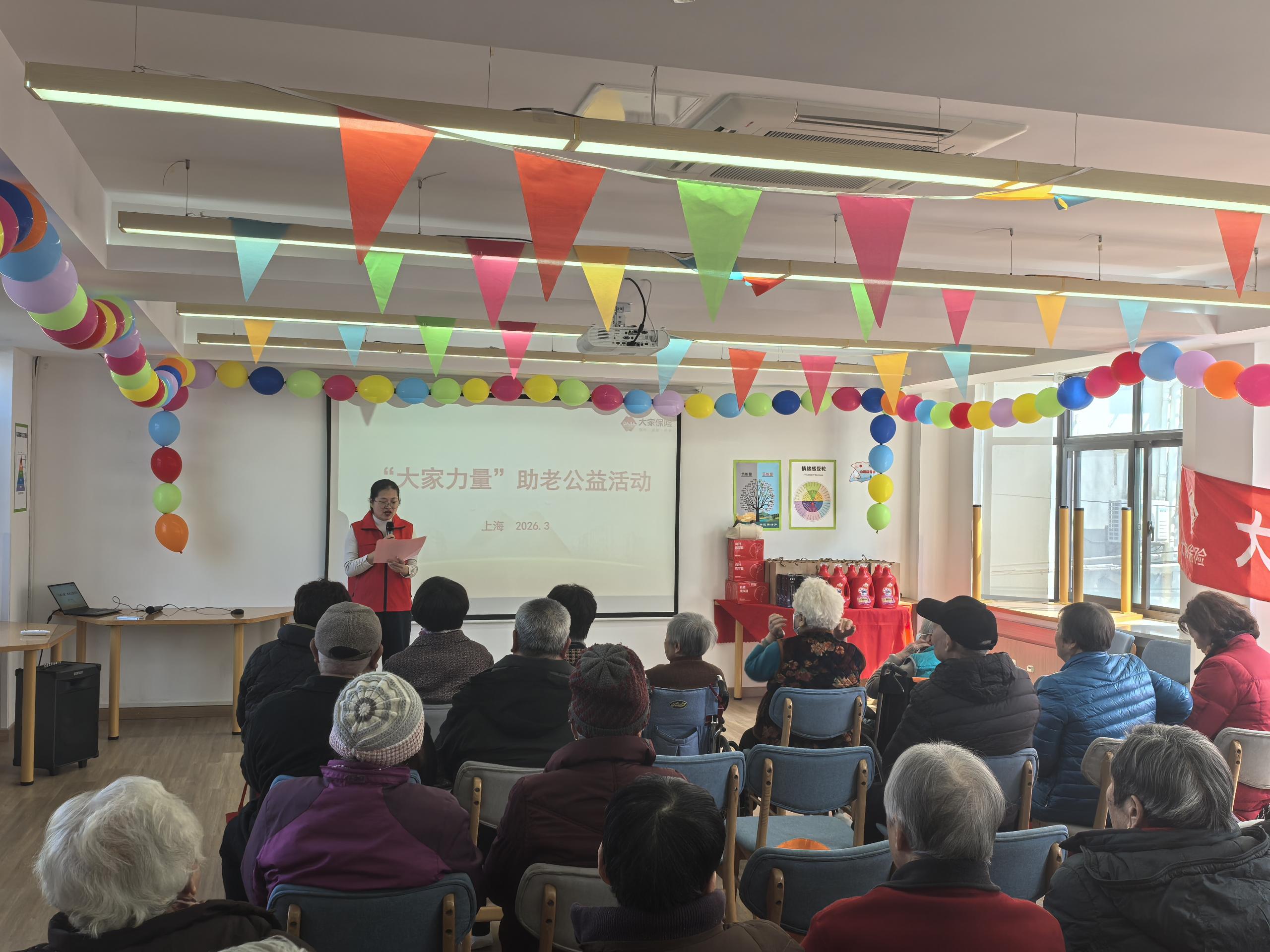2026年3月10日下午,大家保险“大家力量”助老公益活动走进上海惠南镇文源社区综合为老服务中心,以“暖春乐动 乐享晚年”为主题,为30余位长者送上暖心的陪伴与春日的活力。
