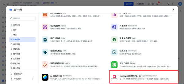 在Lark多维表插件中心搜索「eSignGlobal|全球电子签」即可安装。