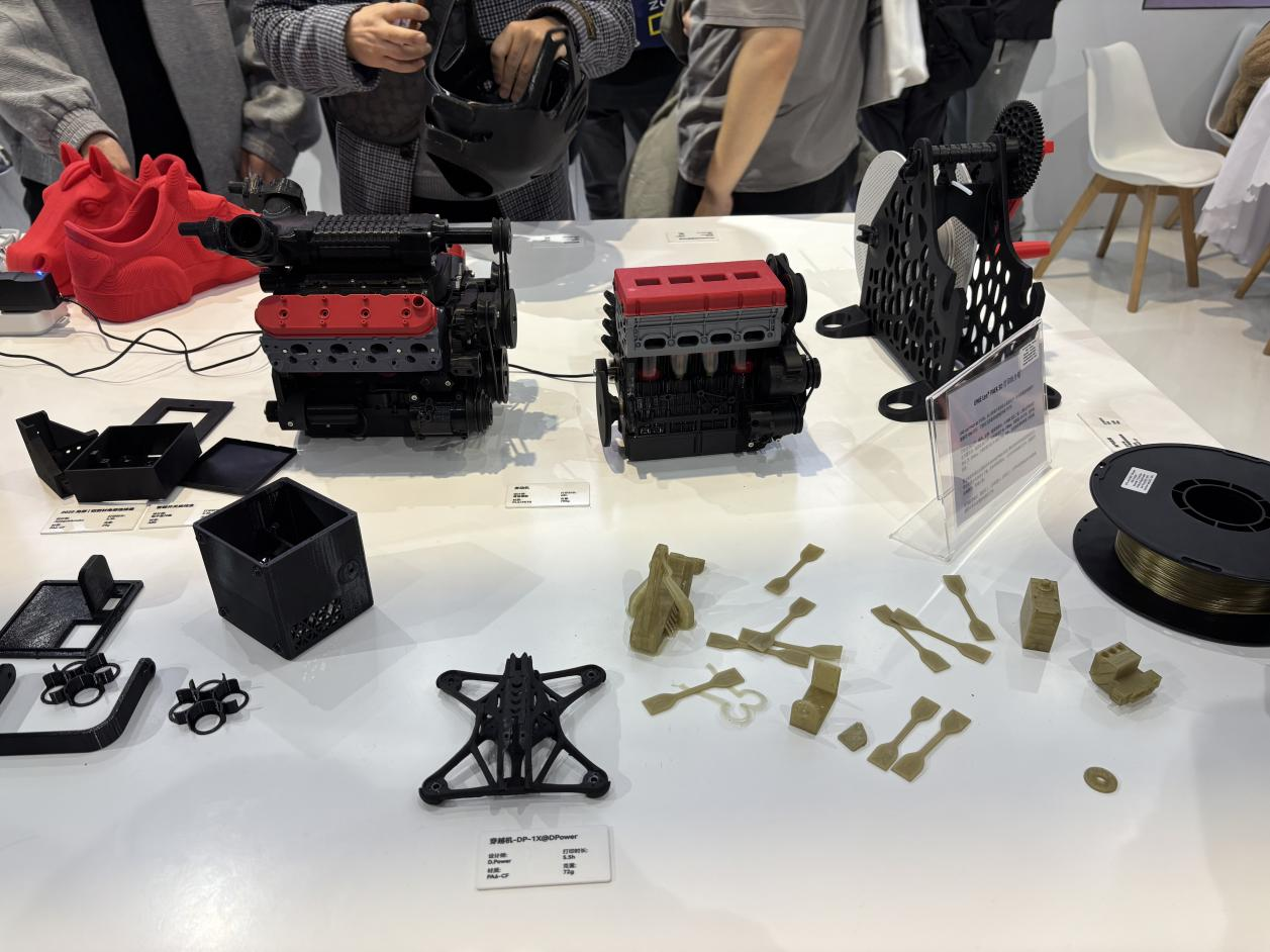 展会现场,拓竹陈列了多款特色模型,涵盖消费级与工业级两大品类:消费级及工艺类模型包括激光刀切模型、花瓶、版画、浮雕画等,满足日常创意需求;工业级模型则包括头盔、定制鞋履、发动机核心部件等,展现高端制造潜力。拓竹曾在2025年蔚来杯中国大学生电动方程式大赛中服务超40支参赛队伍,打印超130个赛车核心精密部件,印证了3D打印从消费创意走向工业精密制造的多元价值。