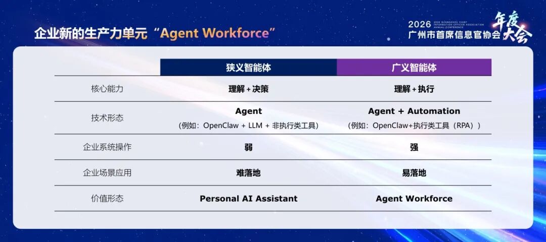 ·广义智能体:强调“理解+执行”,即Agent+执行类工具(如RPA),企业系统操作能力强,易于在复杂场景中落地,可形成可规模化的 “Agent Workforce”(智能体劳动力)。