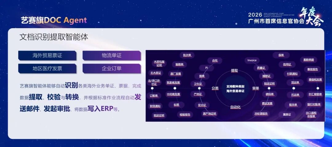 此外,艺赛旗文档识别提取智能体已在海外贸易票证、物流单证、地区医疗发票、企业订单等场景中广泛应用,能够自动识别各类业务单证,完成数据提取、校验与转换,并根据标准作业流程自动发送邮件、发起审批、将数据写入ERP等,真正实现端到端流程自动化。
