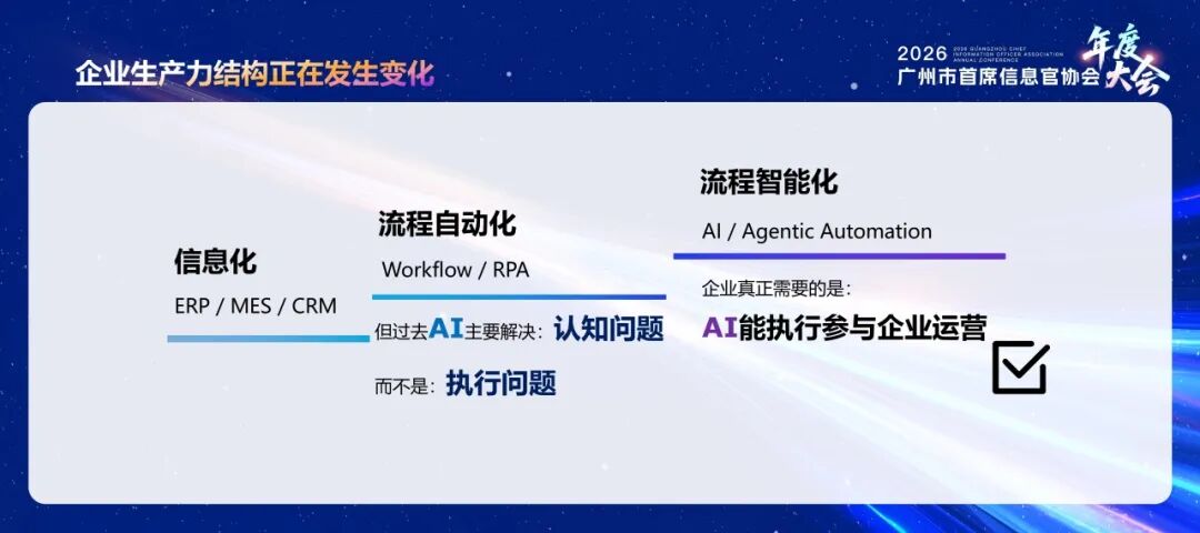 李博在演讲中指出,企业生产力结构正经历从信息化、流程自动化到流程智能化的迭代升级,过去 AI 技术多聚焦解决 “认知问题”,却难以落地实际 “执行问题”,而企业数字化转型的核心诉求,是让 AI 真正参与运营、从 “单纯思考” 走向 “落地执行”。