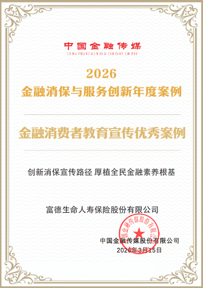 此次斩获"金融消费者教育宣传奖",彰显富德生命人寿在消保宣传领域的创新活力与普惠践行成效。富德生命人寿坚持"常态化宣传+集中性活动"双轮驱动,通过线上线下融合创新,打造多层次、广覆盖的金融消费者教育宣传体系,让金融知识走进千家万户,让消保温度传递给更多消费者。