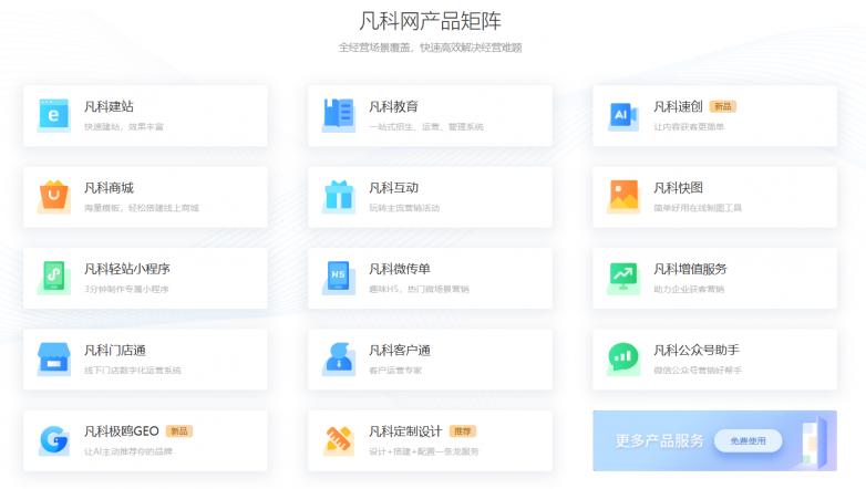 凡科网旗下拥有凡科建站、凡科商城、凡科互动、凡科轻站小程序、凡科快图、凡科门店通、凡科速创、凡科极鸥GEO、凡科客户通、凡科教育、凡科微传单、凡科公众号助手等产品。