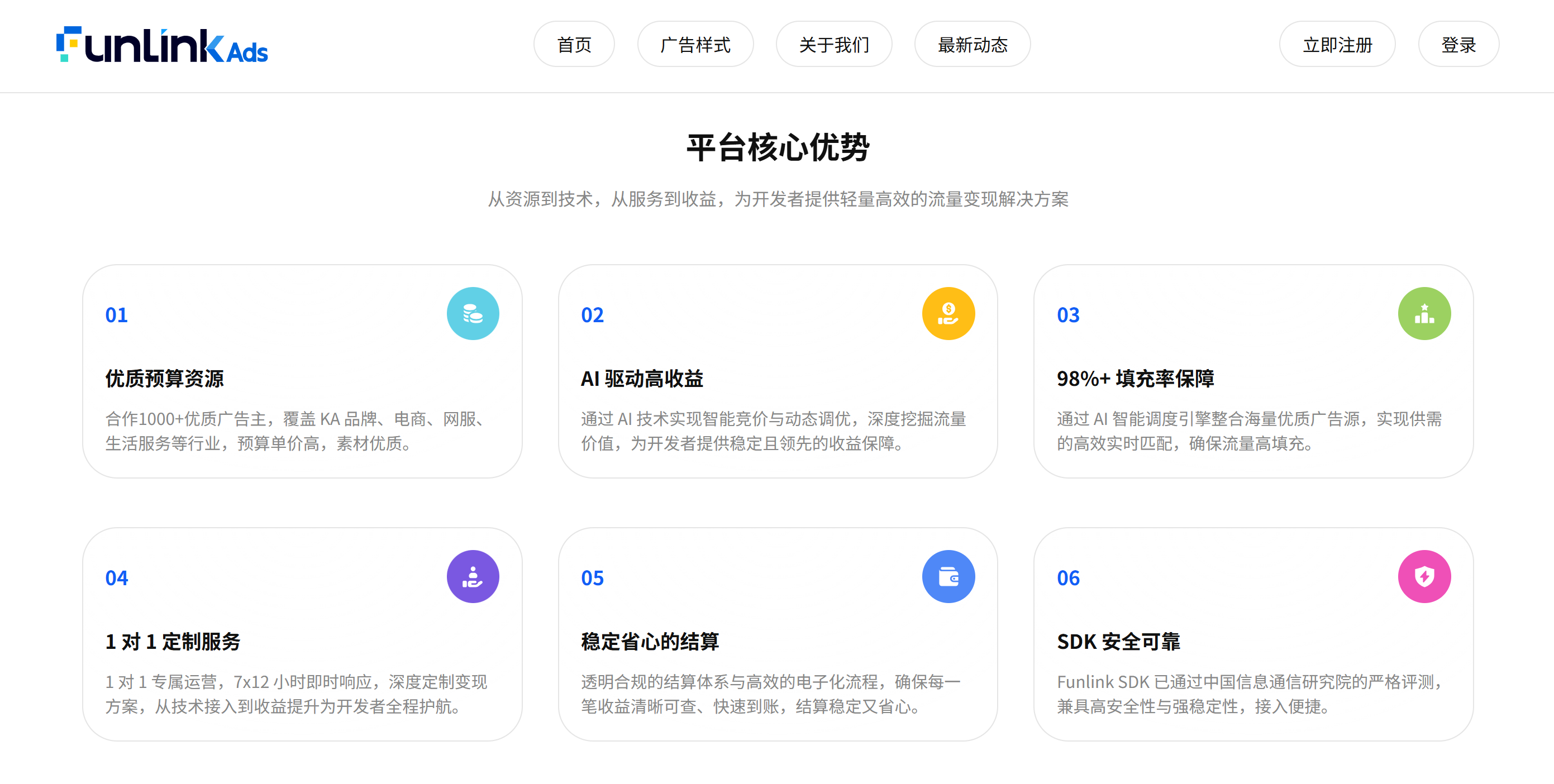 Funlink轻量高效流量变现平台,聚焦破解开发者变现效率低、广告预算单一的核心痛点,以优质广告资源、自研技术引擎、定制化服务为三大核心支撑,助力开发者实现收益最大化与长效增长。