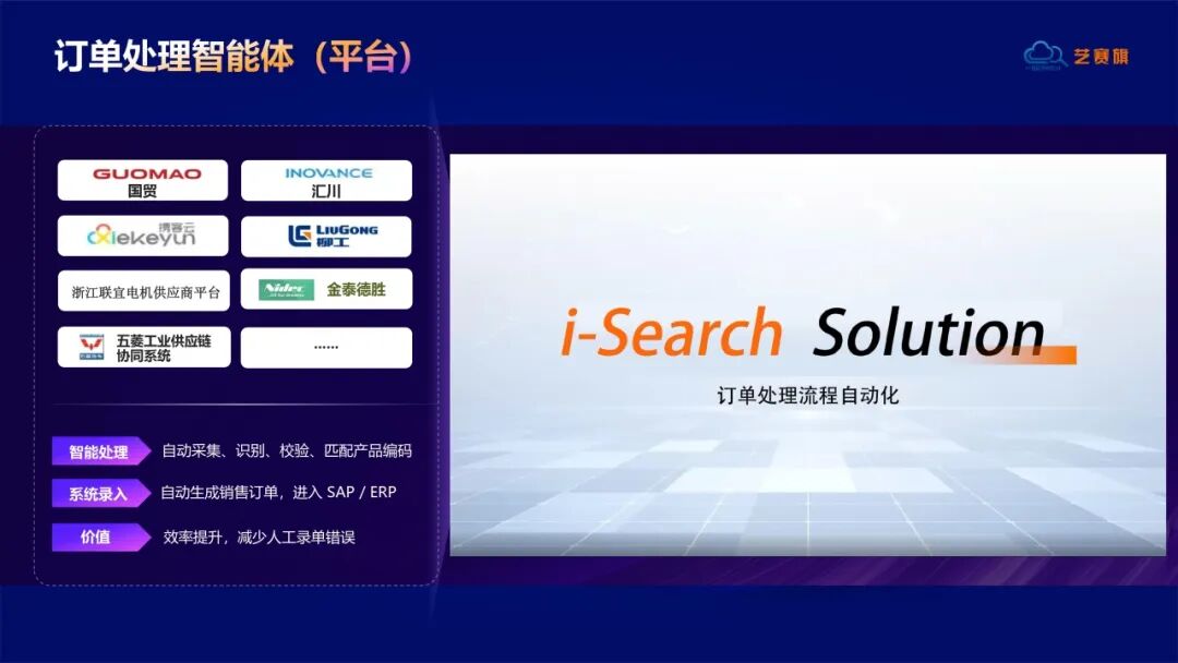 1. 订单处理智能体。 汽车零部件企业通常面临全球订单处理难题——邮件来自不同国家、不同语言、格式不统一,人工处理不仅效率低,还容易出错。艺赛旗订单处理智能体可自动读取全球邮件系统订单,智能提取客户、产品、数量、价格信息,完成数据校验后生成标准销售订单并录入SAP/ERP系统,实现7×24小时全天候响应,让全球订单走向“智能驱动”。