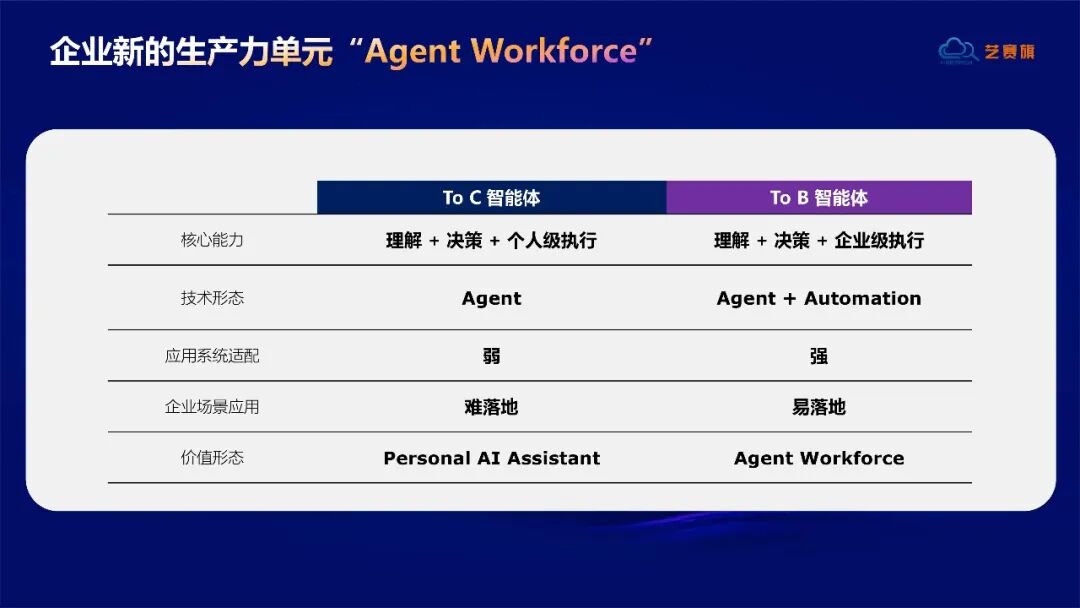 To C智能体聚焦“理解+决策+个人级执行”,更适合个人助理场景;而企业真正需要的是To B智能体——即“理解+决策+企业级执行”的一体化体系,具备跨系统操作、可规模化治理、可审计追溯的核心能力。