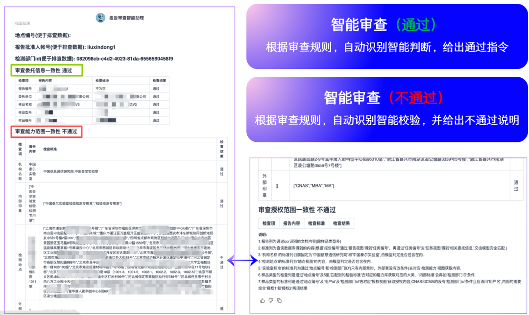 ·事前审查:在报告编写与审核阶段,AI自动校验委托信息、能力范围与授权签字一致性,给出初步审查意见,辅助人工决策。
