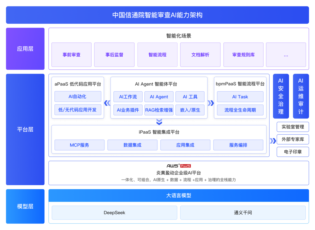 在明确试点场景后,中国信通院并未采用单点应用开发的方式,而是基于炎黄盈动企业级AI平台,对报告和证书的审查规则与业务流程进行统一编排,快速构建可复用、可扩展的智能审查能力架构,并将AI能力嵌入现有业务流程中,实现快速落地。