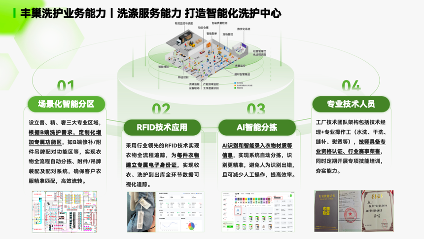 丰巢两座智能洗护中心均引入行业领先的RFID系统,为每件衣物建立专属电子身份标识,实现从收衣、洗护到出库的全流程可视化追踪,提升运营透明度与管理效率。同时,通过AI智能分拣能力,系统可自动识别衣物材质及相关信息并完成分拣,有效减少人工判断带来的误差,在提升识别准确率的同时,进一步提高整体作业效率。此外,丰巢洗护还配备了专业技术团队,由具备行业经验的技术管理人员及一线操作人员组成,覆盖水洗、干洗、织补、熨烫等多个专业环节。相关人员均具备专业资质认证,并通过定期技能培训持续提升服务能力,保障洗护品质的稳定输出。