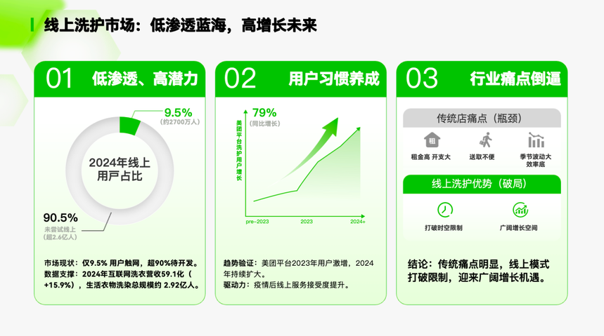 作为民生基础服务板块,生活衣物洗染行业自2023年以来保持稳定增长,市场规模持续扩大。根据中国商业联合会洗染专业委员会与美团联合发布的《生活衣物洗染(线上)消费趋势洞察报告》显示,2023年生活衣物洗染服务营收达637.6亿元,占中国洗染行业年营业收入的49.4%;另外从用户侧估算,2024年生活衣物洗染行业总体规模约2.92亿人,消费基础稳固,与此同时,便捷化服务方式的渗透仍有提升空间。