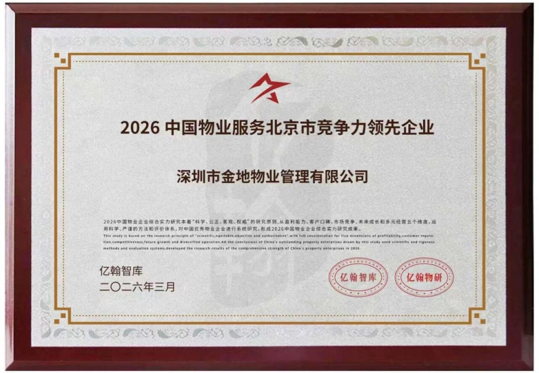 近日,由亿翰智库、亿翰物研主办的“新质·新程·新未来2026中国物业企业综合实力战略峰会”在上海举行,现场重磅发布行业权威研究成果。金地智慧服务凭借突出的综合实力与业主口碑,一举摘得“2026中国物业服务北京市竞争力领先企业”称号,成为首都物业服务高质量发展的标杆样本。