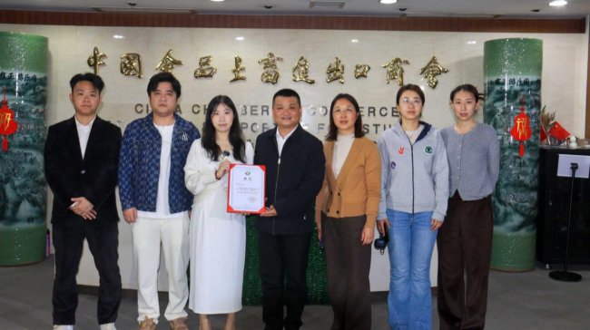 中国食品土畜进出口商会羊绒分会秘书长胡建党为陈昊天颁发聘书,商会畜产部主任田泓、副主任林珊珊,羊绒分会副秘书长陈曦,云生觅瑞公司总经理万熠、副总经理陈梓豪等政企代表共同见证这一重要时刻。